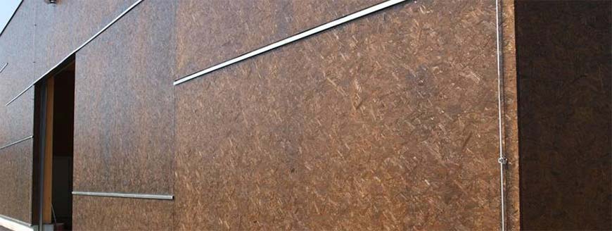Для деревянного каркаса потребовалась легкая и прочная обшивка, способная выдерживать действие влаги и солнечного излучения. Традиционная ДСП для этого не подходила. Она слишком тяжелая и боится влаги. Натуральная древесина для наружной отделки подходит, но ее монтаж нетехнологичен (занимает много времени). Решение было найдено, когда вместо беспорядочного смешивания опилок и стружки применили технологию ориентированной послойной укладки длинной щепы. Связующим веществом для нее стал клей на основе формальдегидных смол.