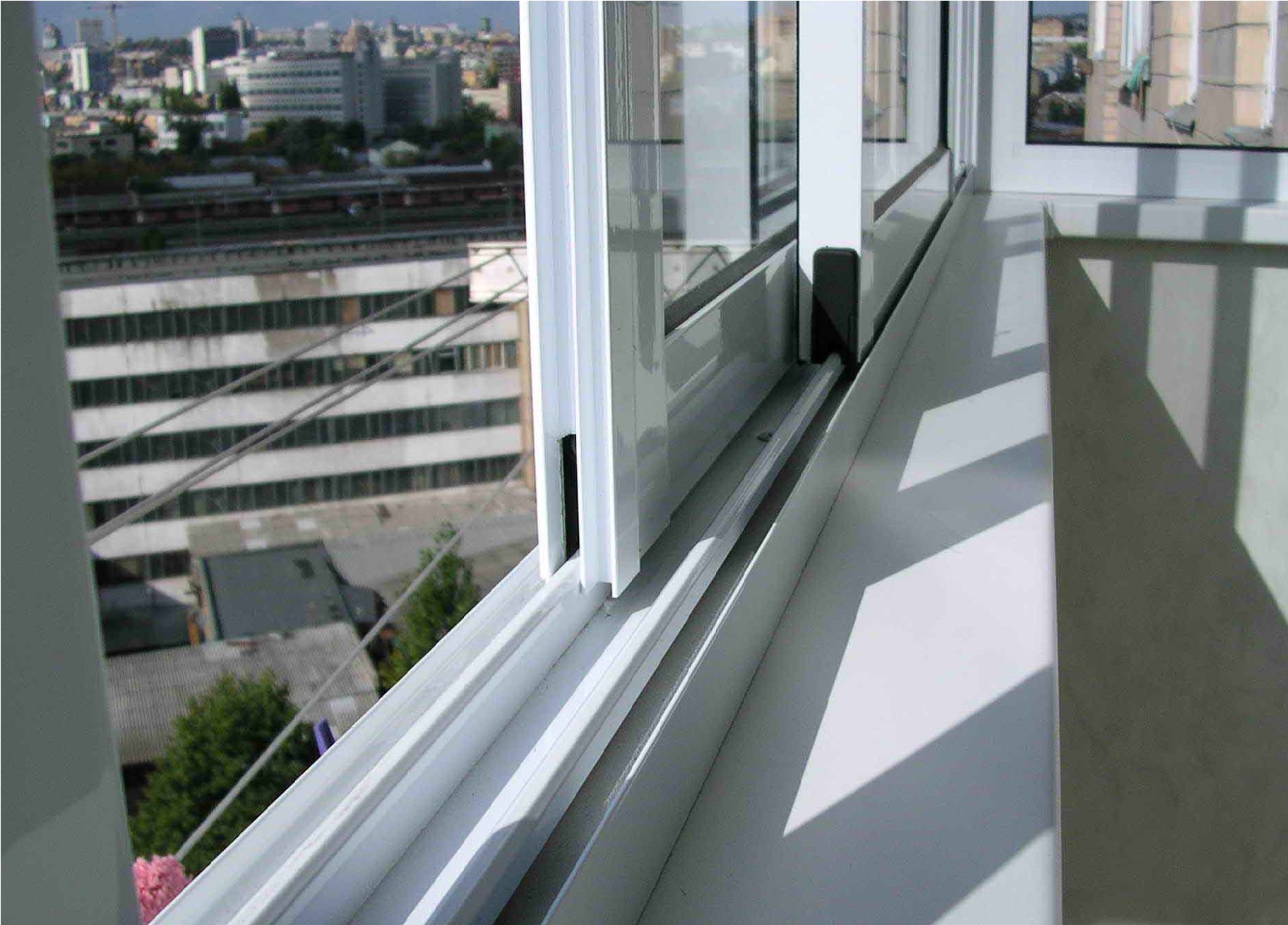 Основой алюминиевых конструкций является каркас из направляющих как у шкафа-купе, по которым скользят створки и москитная сетка, что очень удобно при маленьких размерах помещений, подоконник остается свободным, не требуется дополнительного внутреннего пространства как в случае с распашными окнами.