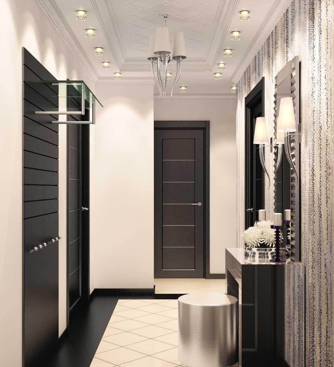 Здесь одной люстрой не обойтись – она не справится с освещением длинного коридора, нормально подсветив только небольшой пятачок. Выход из положения – несколько точечных потолочных светильников, ряд бра или поворотных спотов.