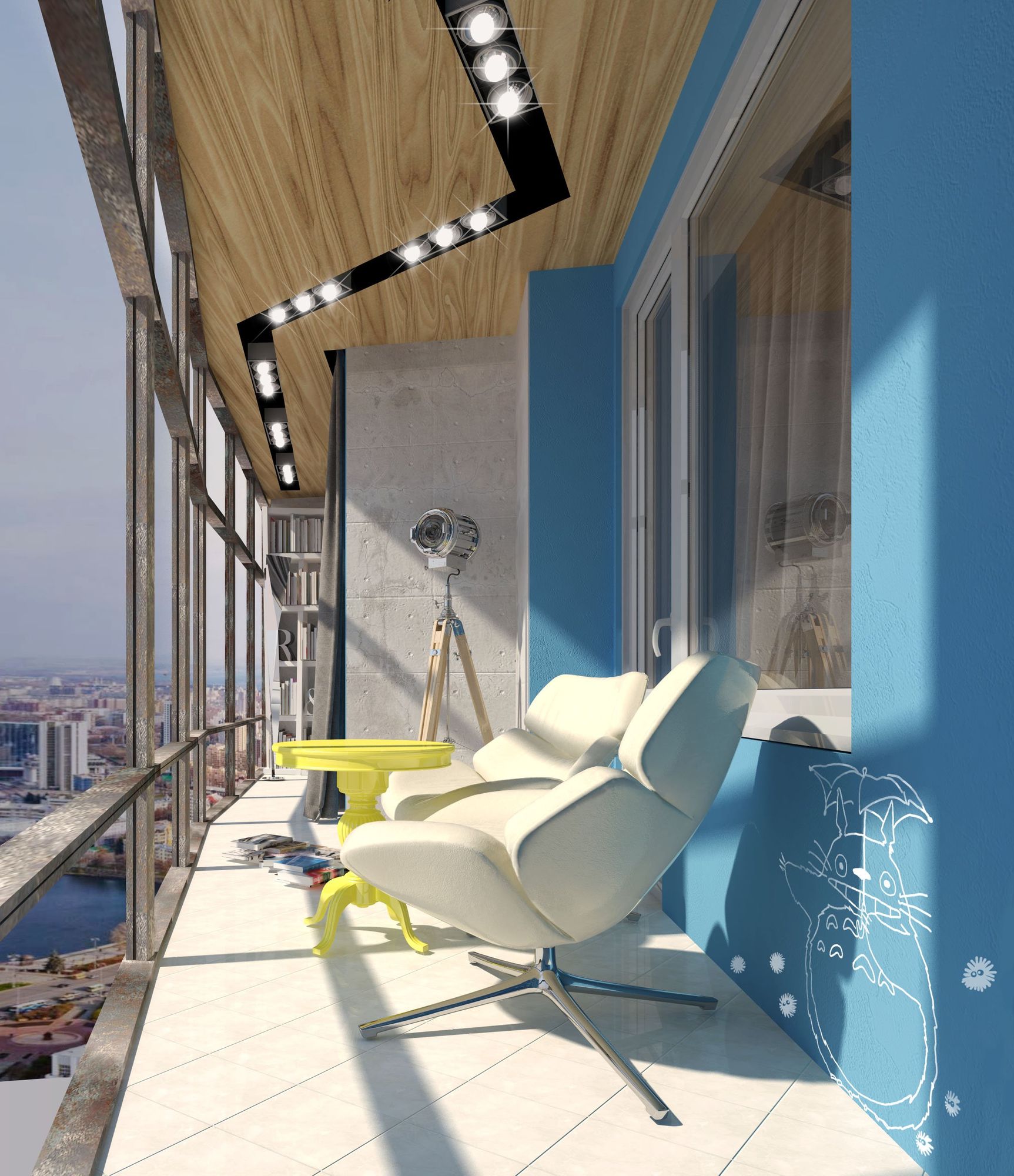 Свисающие с потолка большие люстры или лампы будут визуально скрадывать и так небольшое пространство балкона. Но если у вас огромная лоджия — такие светильники наоборот могут стать интересным акцентом в интерьере. Хороший вариант — светильники-споты, которые можно направлять в разные стороны. С помощью одной такой потолочной или настенной люстры можно организовать освещение сразу всех зон балкона.