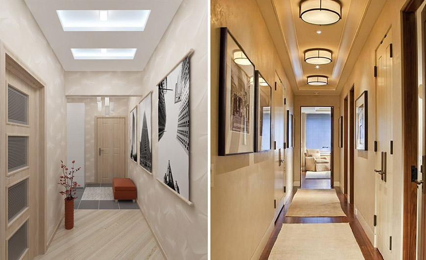 - Если отделка длинного коридора разонравилась, то можно украсить его картинами или поделками с точечными светильниками;
