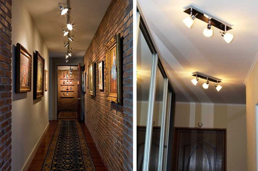 Меньшая часть коридора, идущая параллельно вытянутому коридору, часто получает освещение из основных помещений. Поэтому там достаточно нескольких настенных светильников. В основной зоне следует установить трековое освещение, точечные светильники и/или 2-3 миниатюрные люстры.