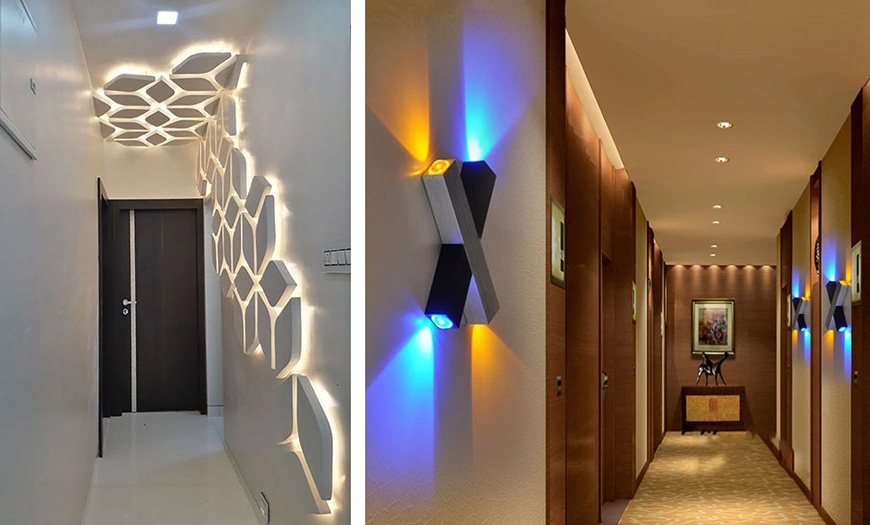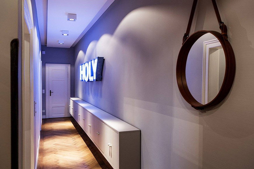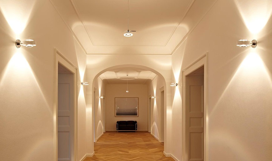 Для этого они разделят освещение длинного коридора на несколько зон. У каждой из них будет своя концепция дизайна. В основной зоне будут установлены приборы с высокой яркостью, освещающие в основном стены или зеркало, так как они могут отражать любые потоки. Если это не помогает, то можно использовать скрытое потолочное освещение с точечными или направленными источниками света (светодиодные ленты).