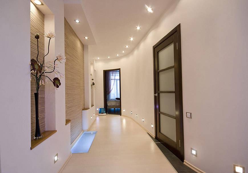 Встраиваемые точечные светильники. Оптимально подходят как для тесных, так и просторных коридоров. Хорошо, если приборы имеют регулировку направления света. Их устанавливают на потолке или вдоль стен.