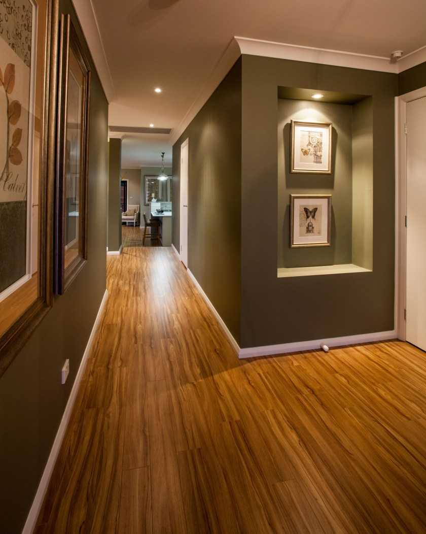 Использование двух зон в таких коридорах является одной из основных характеристик. Этого можно добиться, применив к каждой зоне освещение в одном стиле или разное.