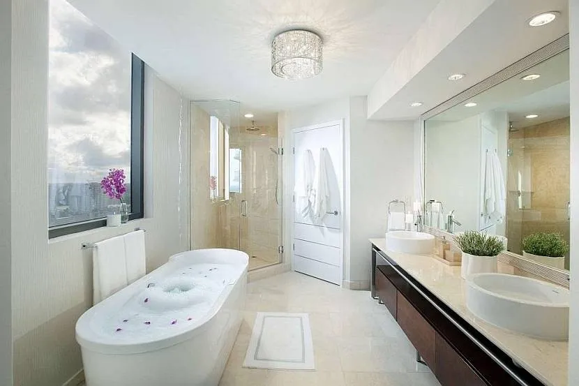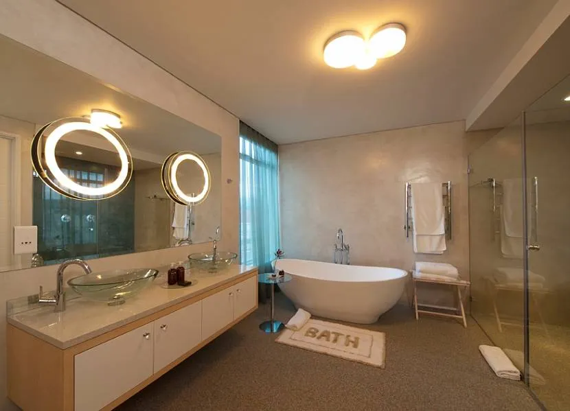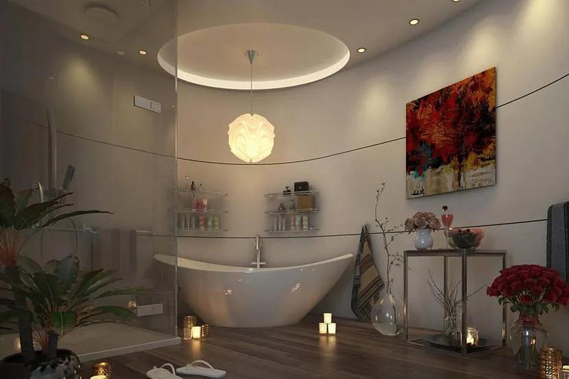 Шикарным видом обладает душевая лейка с подсветкой, создающая цветной поток воды. Не менее необычным решением считается потолок в виде звездного неба или светящихся капель со светодиодными точечными элементами. Для создания оригинального освещения при помощи подсветки декорируют бортики ванной и подиумы, а точечными светильниками оформляют ниши, экраны или плинтуса.