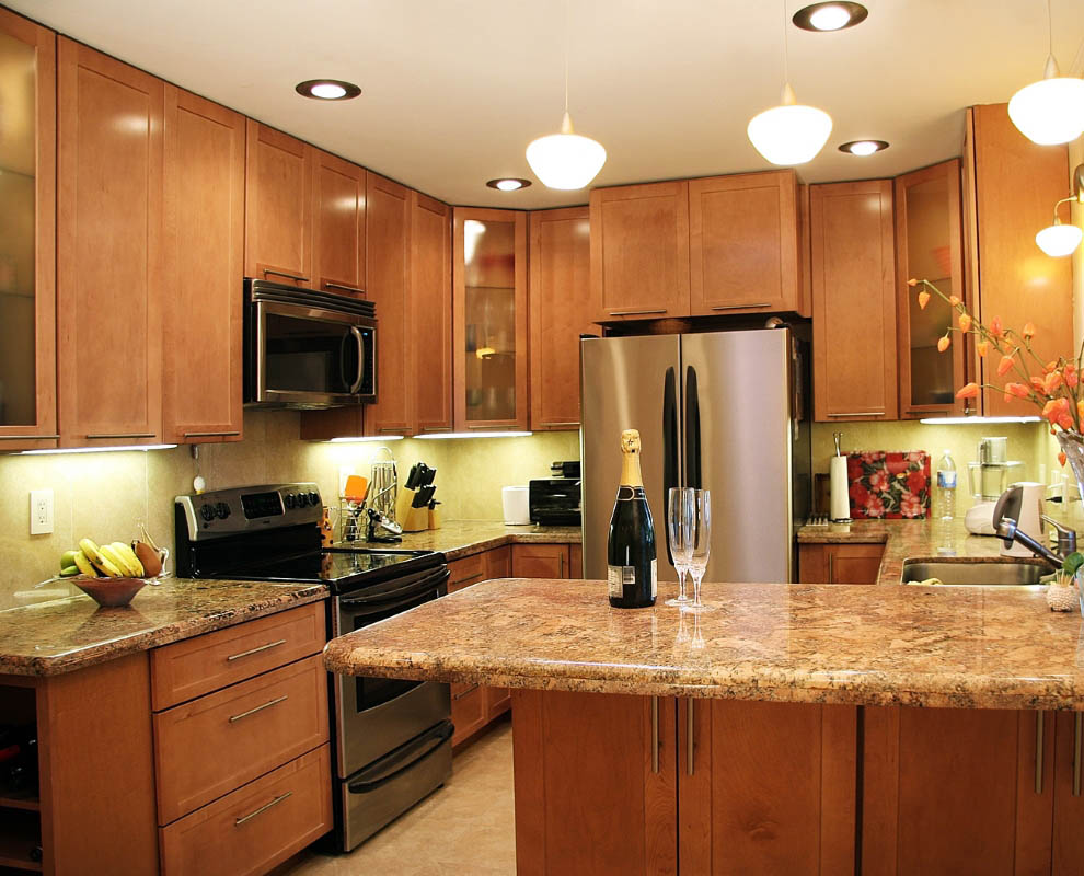 Для подсветки той области, в которой расположены полки или шкафчики, лампа может не использоваться, а вместо нее устанавливают светодиодные светильники в виде LED-ленты. Для создания оригинального дизайна и дополнительной подсветки можно прибор закрепить на натяжной потолок по периметру.