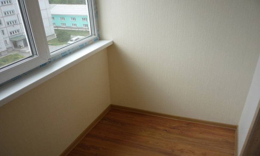 На фото лоджия, стены и пол которой отделаны ламинатом.