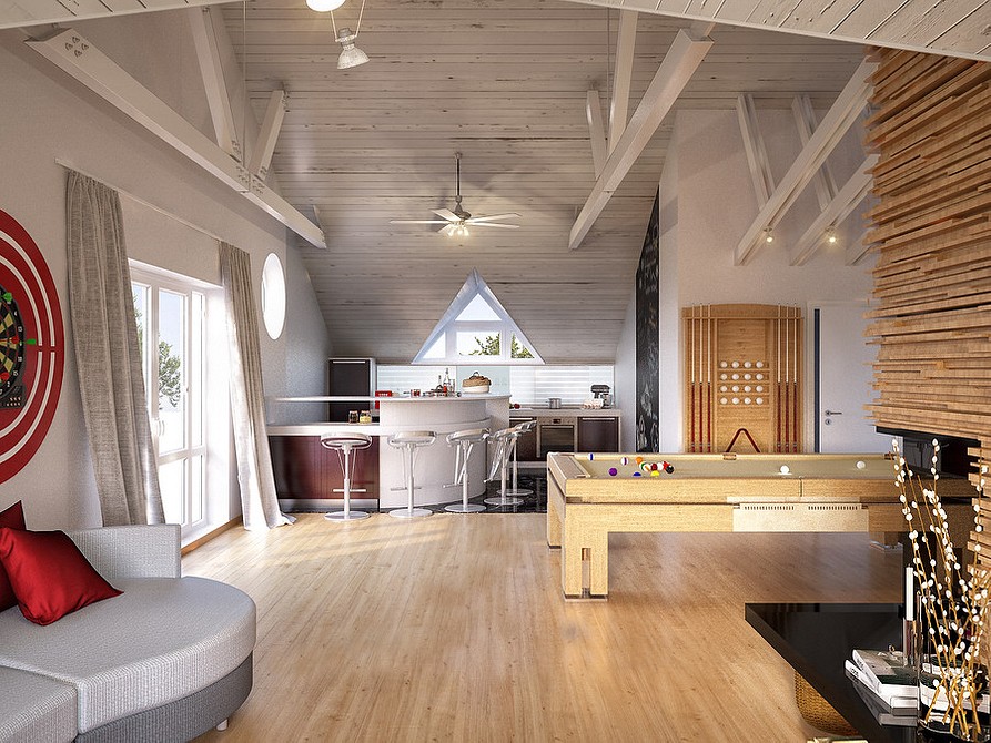 Обычно чердак используется в качестве комнаты отдыха или бильярдной. Естественное освещение с точечными светильниками наполнит пространство светом.