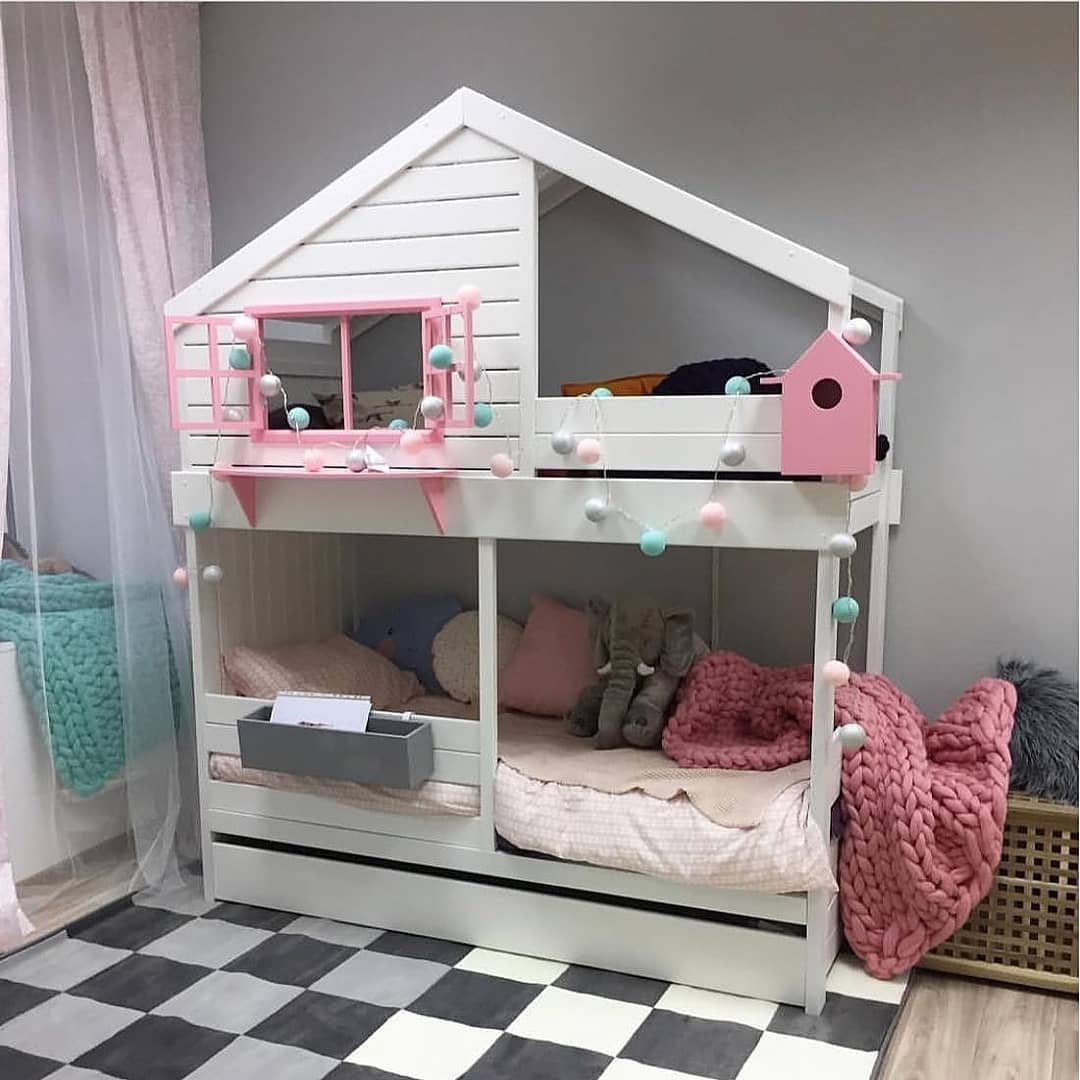 На фотографии представлен дизайн детской комнаты для девочки, расположенной на чердаке бревенчатого дома.