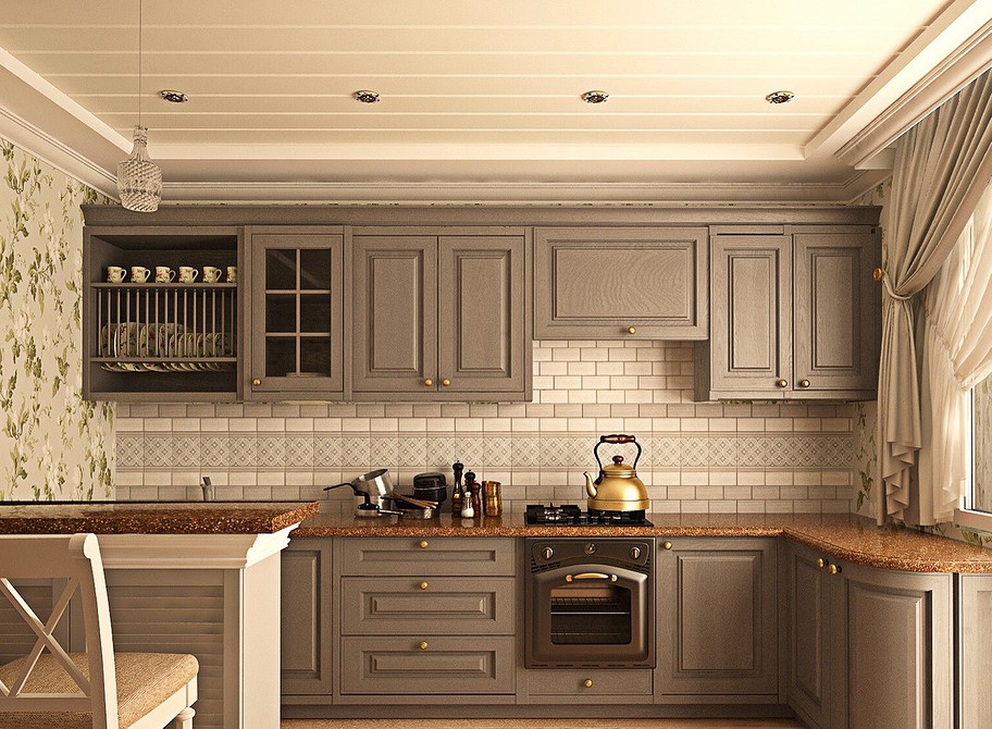 На кухне в основном остались стены из натурального дерева. Иногда, в зависимости от стилевого решения, в качестве отделки используется штукатурка или краска. Фартук выложен керамикой, например, лоскутным узором.