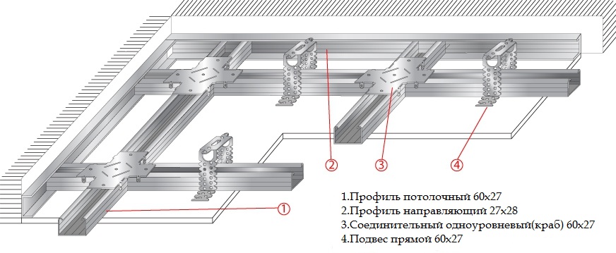 Поперёк комнаты также монтируются профили, которые можно изготовить из направляющих. Они закрепляются так называемыми «крабами» — специальными соединительными элементами. Если их нет, можно просто вкрутить саморезы по металлу. После этого каркас ещё раз проверяется на ровность уровнем.