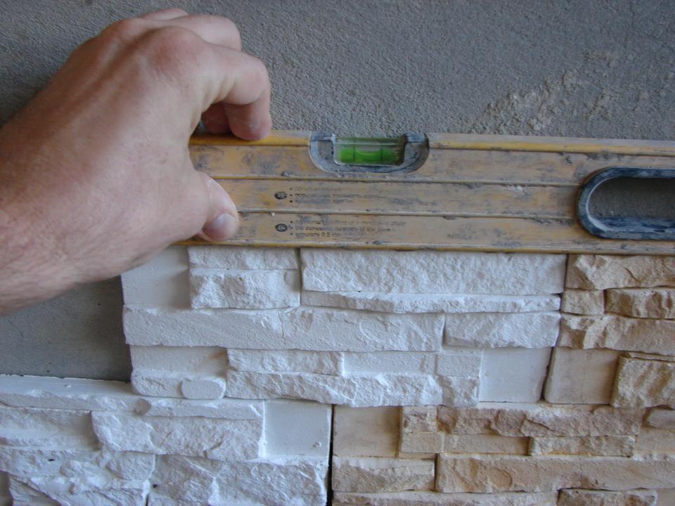 Готовые «камни» распределяются на стене с умышленным зазором в 2-3 мм. Каждый элемент тщательно прижимается валиком. После полного высыхания швы обрабатываются затиркой. Завершающим этапом будет нанесение водоотталкивающей грунтовки.