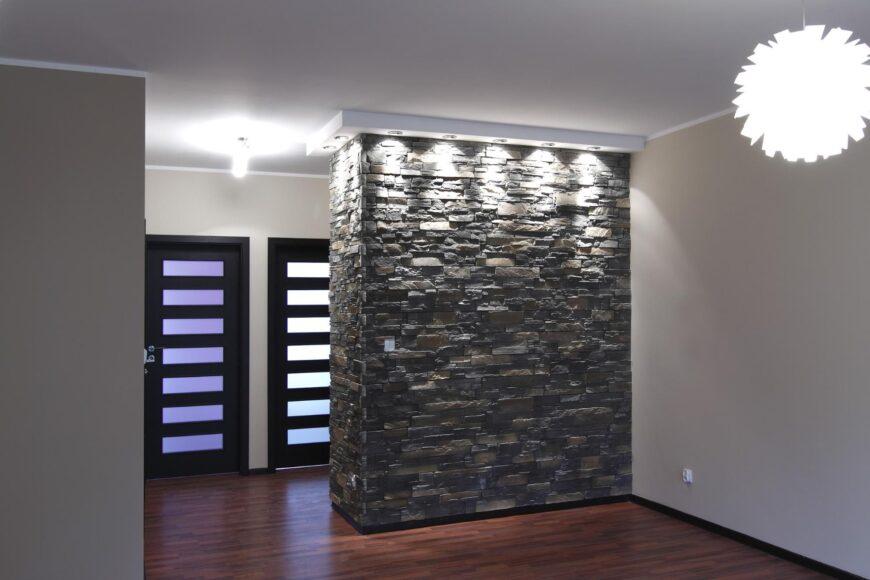 - Если отделка стен в коридоре предусматривает укладку декоративного камня с перевязкой швами, по окончании процесса, необходимо заполнить получившиеся швы раствором или специальной смесью для придания законченного внешнего вида выложенным участкам.