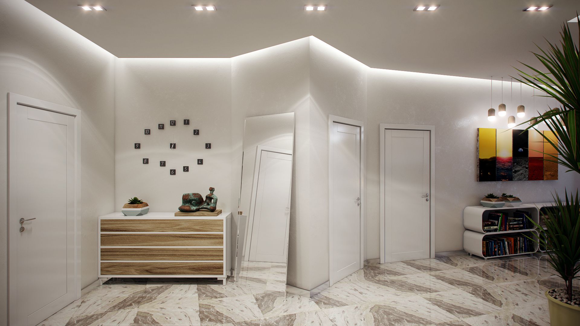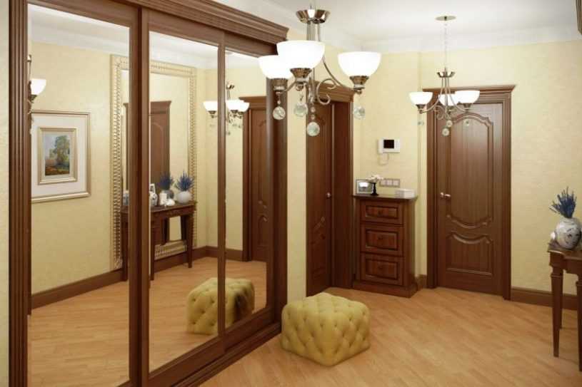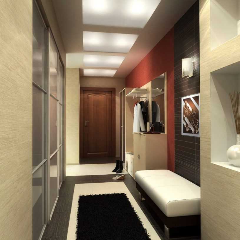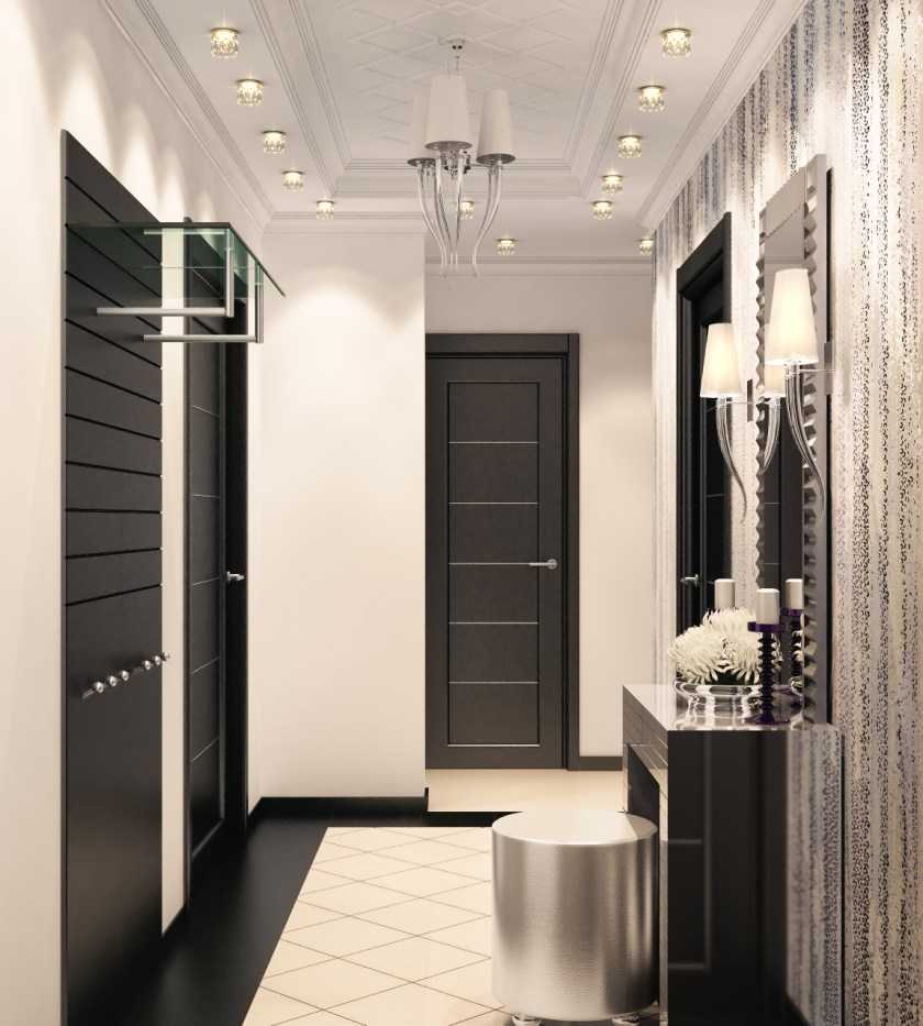 Люстры и классические светильники в прихожих совсем не актуальны. Особенно, когда это стандартная прихожая-коридор без окон в квартире. Тебе нужна серия потолочных светильников и зональная подсветка у зеркала и других важных зон. Интересный прием – подсветка у пола вдоль шкафа, чтобы можно было легко пройти даже ночью.