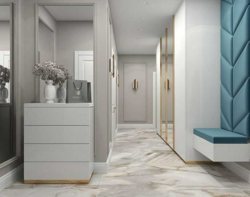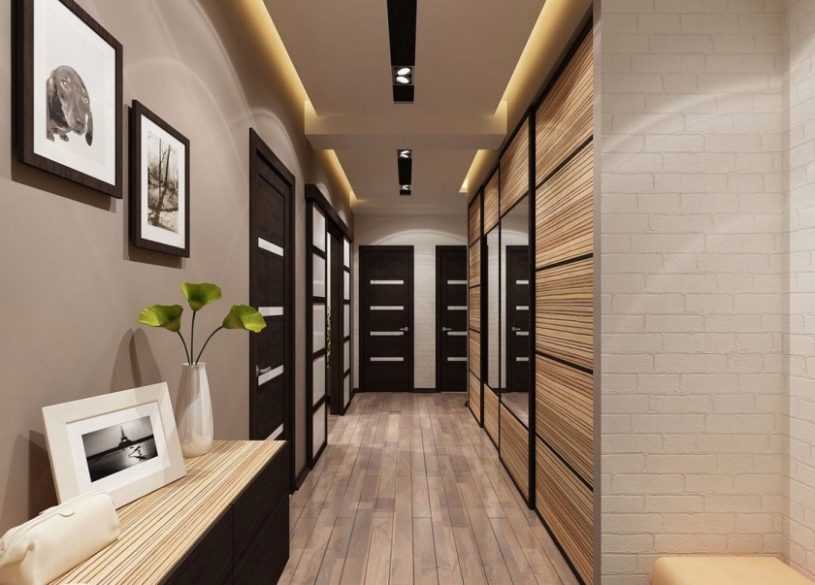Расположение модулей зависит от формы коридора. Если помещение узкое и длинное, всю мебель лучше расставить вдоль стены без дверей или с меньшим их количеством. Свободную стену можно украсить зеркалами, что дополнительно расширит пространство.
