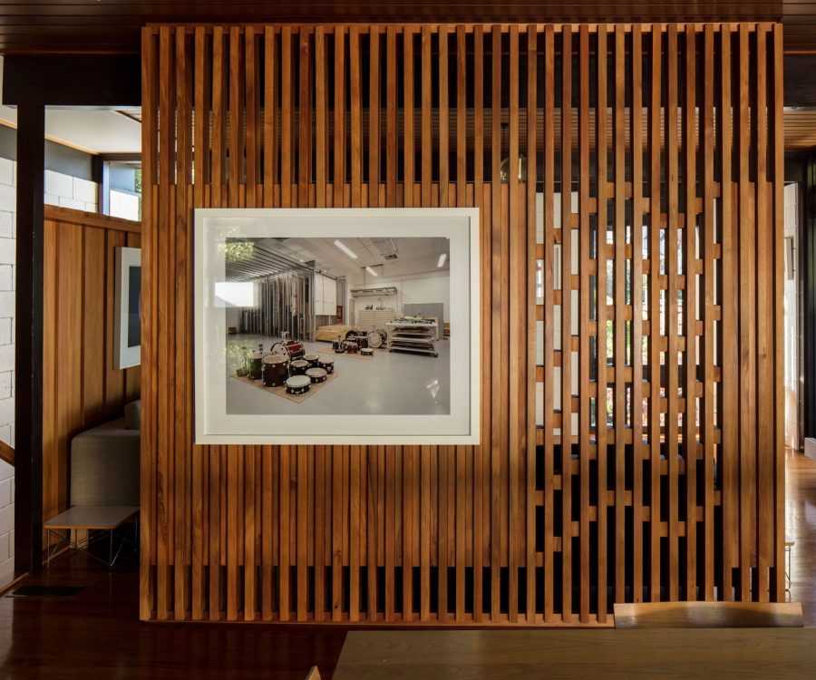 С помощью деревянных перегородок можно зонировать гостиную. Если она совмещена с кухней реечная конструкция отделяет столовую зону от кабинета.