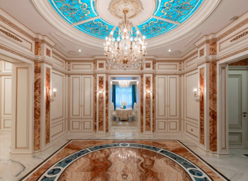 В зависимости от выбранного стиля основную отделку совмещают с фресками, зеркальными или стеклянными вставками. Фрески являются стилевым акцентом, а зеркало и стекло выполняют функцию визуального расширения пространства.