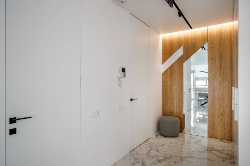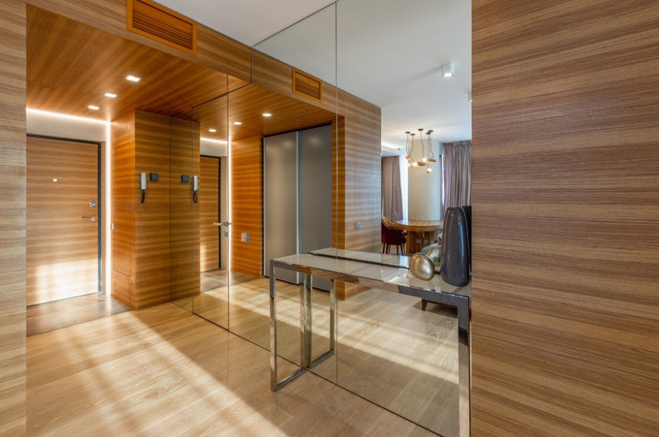Небольшая прихожая в стиле минимализм с отделкой стен МДФ-панелями светлого оттенка древесины, визуально увеличенная с помощью зеркальной отделки одной из стенИсточник i.pinimg.com