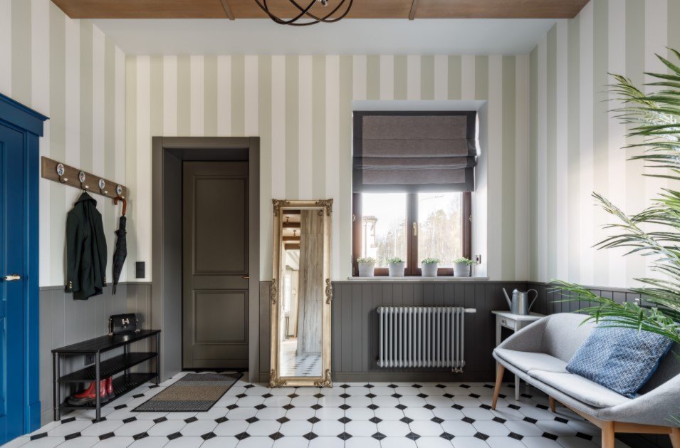 Для комбинированных вариантов хорошо подходят листовые панели под натуральный камень, пробку или бамбук. Крупногабаритные прихожие уместно разделить на две зоны: вход и вестибюль. Для них используют разную отделку, но в едином стиле. Зону входа отделывают более практичными, износостойкими материалами (натуральный или искусственный камень, плитка ПВХ), а зону вестибюля – обоями, декоративной штукатуркой или краской.