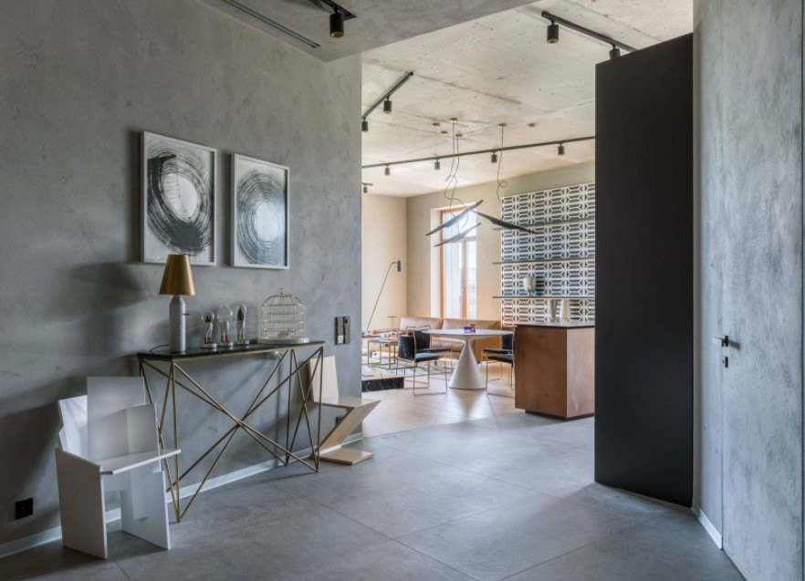 Прихожая в стиле хай-тек с отделкой стен микроцементом и искусственным камнем с имитацией кирпичной кладкиИсточник dm-steklo.ru