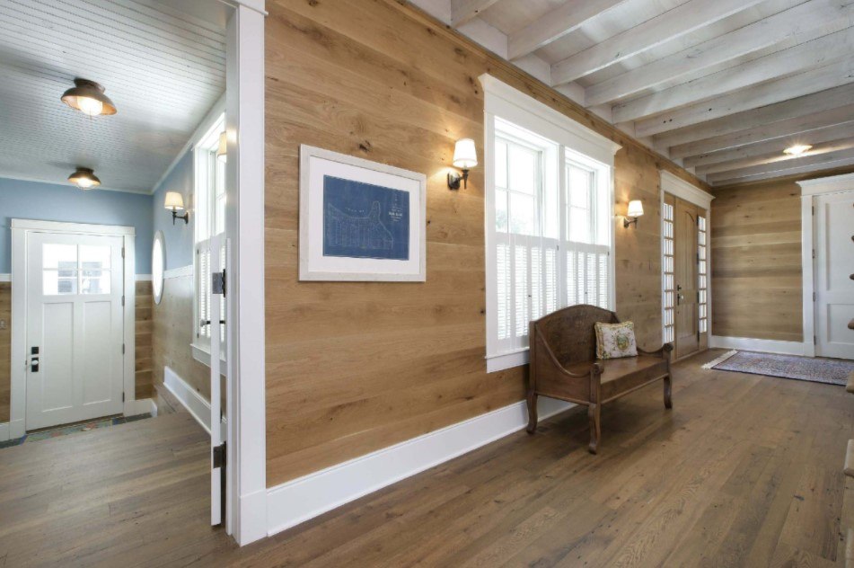 Массив дерева относится к элитному облицовочному материалу. Коридор для отделки стен которого выбрали такой вид полотна выглядит благородно и аристократично. Обычно, их размешают в нижней части стены, сочетая с другим типом облицовки.