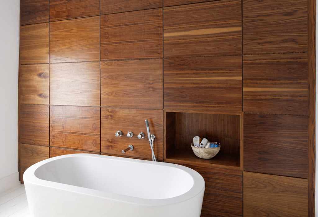 Мы разберём каждый отдельно, но прежде вот пачка фотографий ванных комнат, где при дорогом ремонте и стильном дизайне, отделка очень консервативная. Подбор сантехники, освещение, даже полотенца правильных цветов — не отделкой единой.