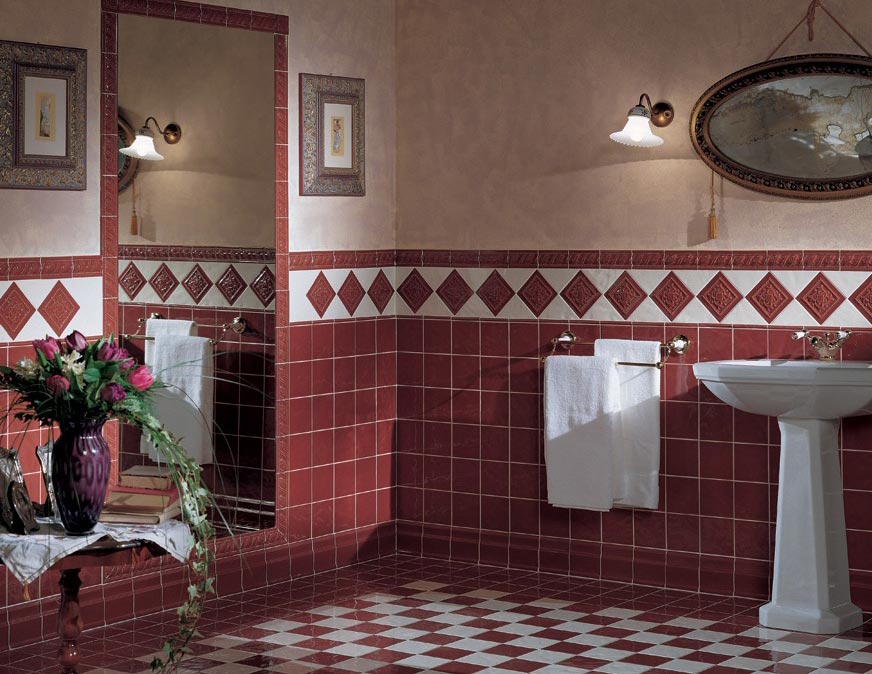 На фото ванная комната в английском стиле с бордовым кафельным полом и настенной плиткой.