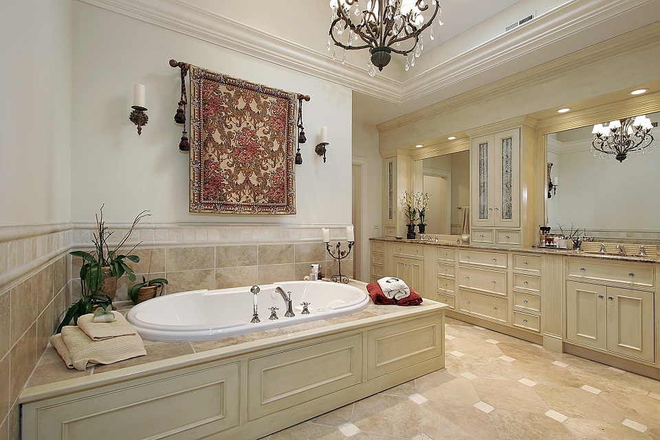 Чашу ванной имеет смысл установить посередине комнаты, что придаст помещению больше шика и уникальности. Такое решение желательно применять в просторной комнате. Притом мебель подобрать очень помпезную в стиле «барокко». Подойдут и классические варианты полочек, шкафчиков для ванной, а также раковины.