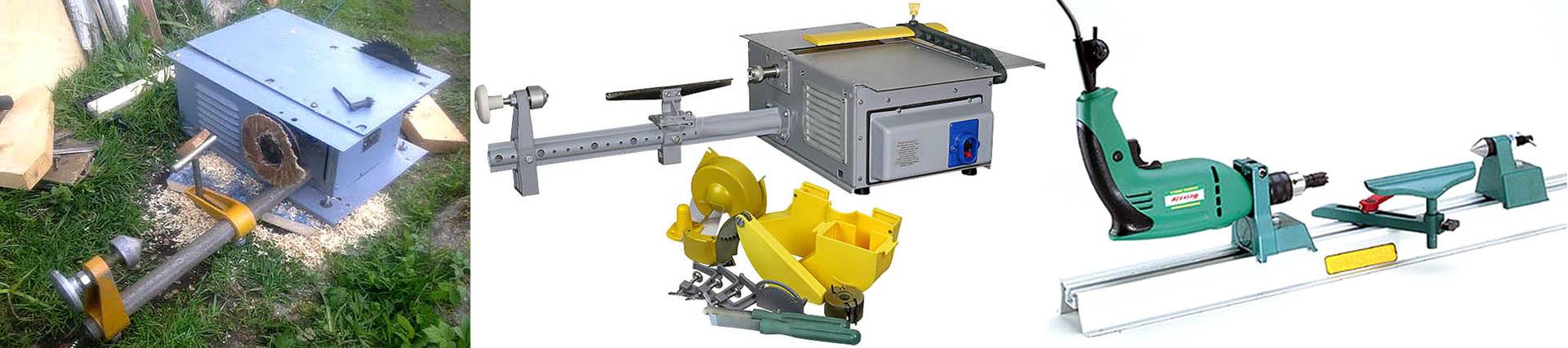 Еще вариант, скорее всего, подешевле, но уже только для горизонтальной сверловки и токарки – станина для дрели, превращающая ее в токарный станок, справа на рис. Станины сверлилок под дрель продают уже чуть не на улицах вразнос, а вот о токарных известно далеко не всем. Между тем электродрель как привод станка по дереву имеет серьезные достоинства (см. далее), и токарный станок с ней будет не хуже фирменного. Но в разы дешевле.