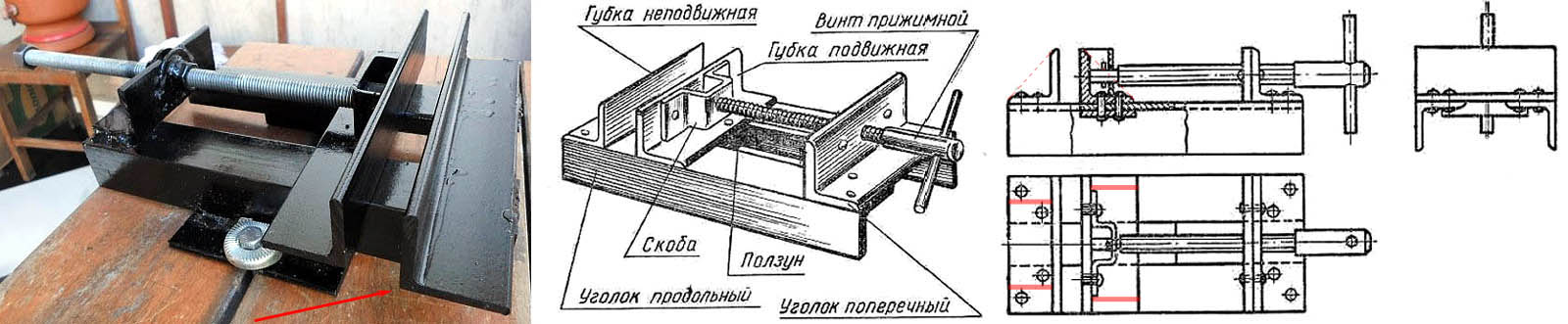 Схема устройства самодельных станочных тисков из уголка на болтах дана в центре на рис; справа – чертежи их общего вида. Ползун и скоба под прижимной винт сгибаются из стальной полосы толщиной от 1,5 мм. Винт в ней можно фиксировать проточкой, т.к. его фиксация работает только при отводе подвижной губки и нагружена ничтожно. На прижиме хвостик винта упирается непосредственно в губку; самый винт – М16-М20. Дополнительно о самодельных станочных тисках из уголка см. видео: