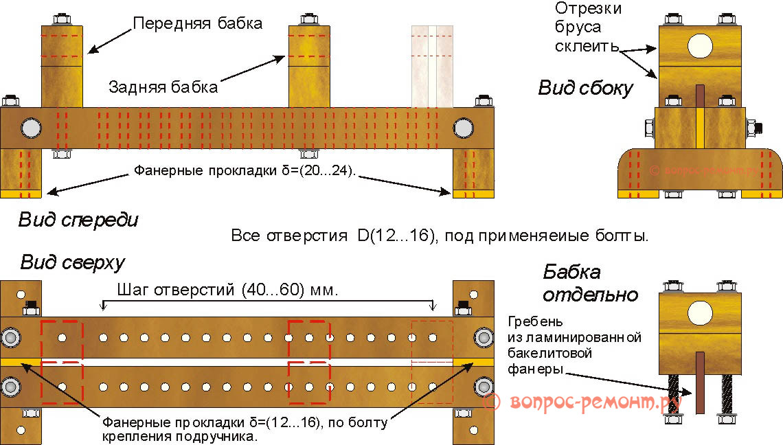 Основной конструкционный материал – стандартный дубовый брус 100х100 длиной 3 м. Габаритная длина станины 1,2 м. Чертеж в масштабе, недостающие размеры можно снять и пересчитать в мм с него. Если хорошего дуба есть больше, длину станины можно увеличить до 1,5-2 м. Обе бабки одинаковой конструкции и рассчитаны под самодельные узлы вращения, см. далее. Гребни внизу на бабках исключают перекос центров. Вся конструкция может быть выполнена ручным столярным инструментом и электродрелью.