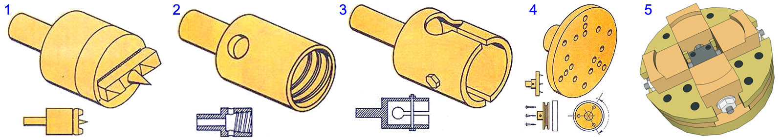 Ответ на этот вопрос не так страшен, как черта малюют. Универсальный держатель – трезубец, поз. 1 на рис. Именно такими снабжаются бытовые деревообрабатывающие станки, напр. упомянутый УБДН-1. Хвостовик или гладкий под зажимной патрон, или резьбовой для установки на вал. Держатель-трезубец надежно держит заготовки до 100-120 мм диаметром, а круглые – до 200 мм. Недостаток один: самому хороший трезубец к токарному станку по дереву сделать очень трудно.