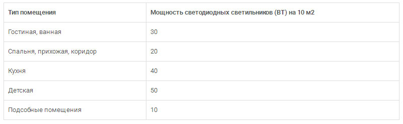 В ней приведены суммарные мощности светильников на 10м2 освещаемого помещения. А также зависимость этих показателей от типа самой комнаты: спальня, ванная, гостиная, кухня и т.п.
