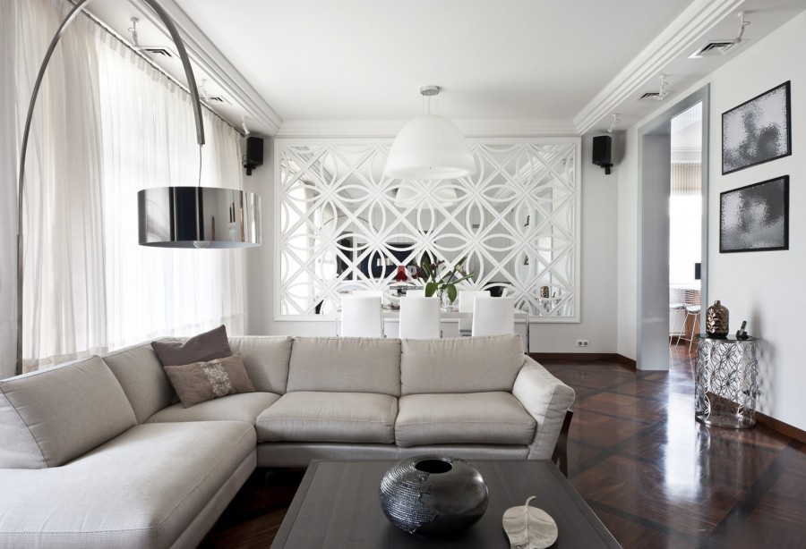 Особенно органично будут смотреться модульные и фигурные модели, световые, скульптурные, зеркальные, керамические и гипсовые изделия или другие интересные варианты, которые вдохнут в гостиную новую жизнь.