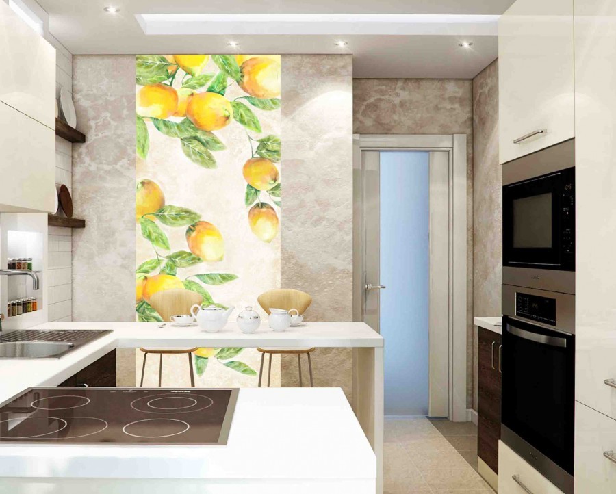 - Керамическая плитка. Такое панно может занимать как всю стену, так и какую-то ее часть. Часто выбирают полотно без чётких границ, они как бы размываются в пространстве, создавая элемент незаконченности. Такое панно прочное, долговечное, легко моется, разнообразное в плане декора.