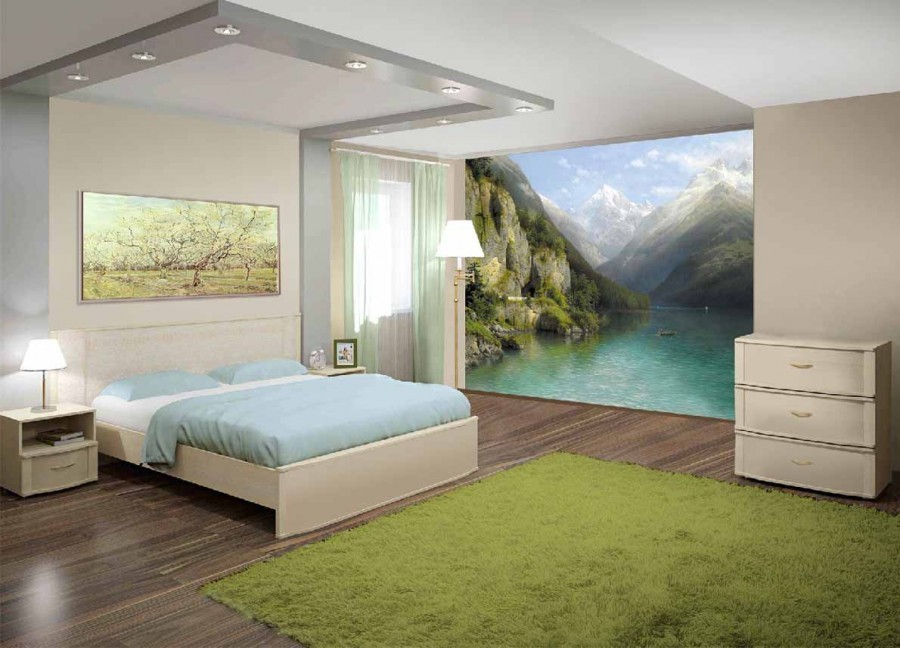 Лучше разместить изображения природы напротив ложа, как на фото панно в спальне на стену. Довольно оригинально смотрятся картины с космическими видами.