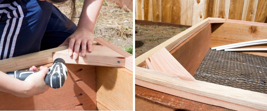 - крепим покрытие степлером к доске обвязки сверху, чтобы металлические скобки крепежа оказались с внутренней стороны будущей конструкции;
