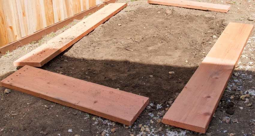 Уложить детали в траншею, проверить размеры, диагонали. Зафиксировать все, используя саморезы. Получить более прочное основание можно, если торцы доски напилить, установить один в один, просверлить и стянуть при помощи болтов. По сторонам, по верху основания стоит приклеить рубероидом. Это позволит создать надежную гидроизоляцию. Высыпанный грунт вернуть на прежне место.