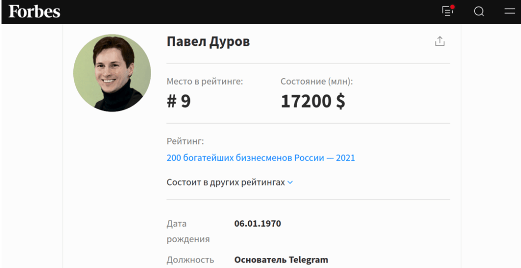 Сейчас журнал Forbes оценивает состояние Дурова в 17,2 миллиарда долларов.