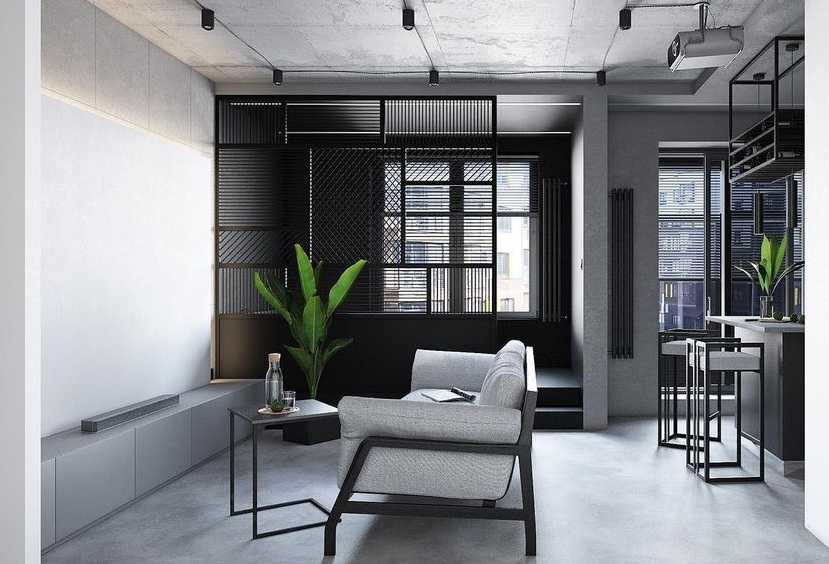 Планировка квартиры-студии предполагает размещение спальни в углу, рядом с окном. Зона отделена двумя конструкциями. Одна глухая стена выстроена перпендикулярно к стене с окном. Вторая декоративная перегородка с прозрачной частью стоит параллельно по отношению к окну. Чтобы усилить эффект отдельности, были использованы и другие методы зонирования: весь угол был выкрашен в чёрный цвет, а кровать установлена на подиуме – получилась уютная чёрная спальня.