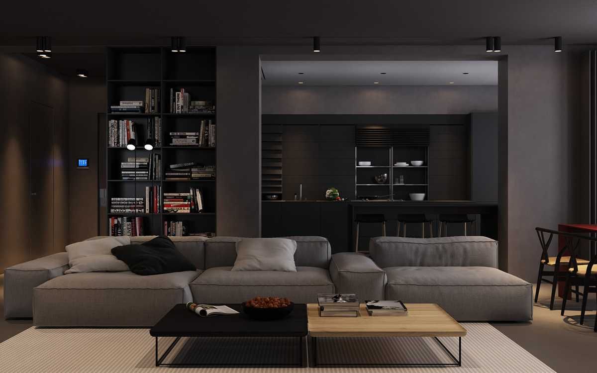 Через арочный проём открывается вид на чёрную кухню