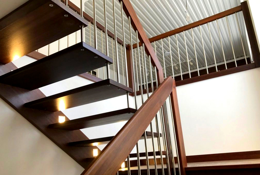 Для внутренних лестниц частного дома максимальное количество ступеней в марше — 15 штук, минимальное — 3 штуки. Обычно длину марша ограничивают 10-12 ступенями, иначе конструкция получается громоздкой. Поэтому если речь идет о подъеме на второй этаж, а не на подиум или другой уровень (в случае когда дом стоит на склоне), то используют не менее двух маршей. Поэтому большинство конструкций имеют проекцию в виде буквы «Г» (для двух маршей) или буквы «П» (для трех маршей).