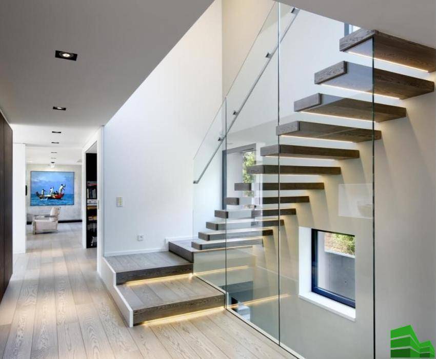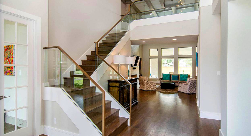 Стеклянные перила на лестницах можно встретить как в современных домах, так и в торговых и бизнес-центрах. Стеклянные перила и лестницы придают помещению определенный стиль, они не препятствуют проникновению света, и в случае, если лестница расположена в центре помещения, не будет происходить затенения пространства за ней. Стеклянные перила с подсветкой в темное время придадут лестнице эффектный вид.