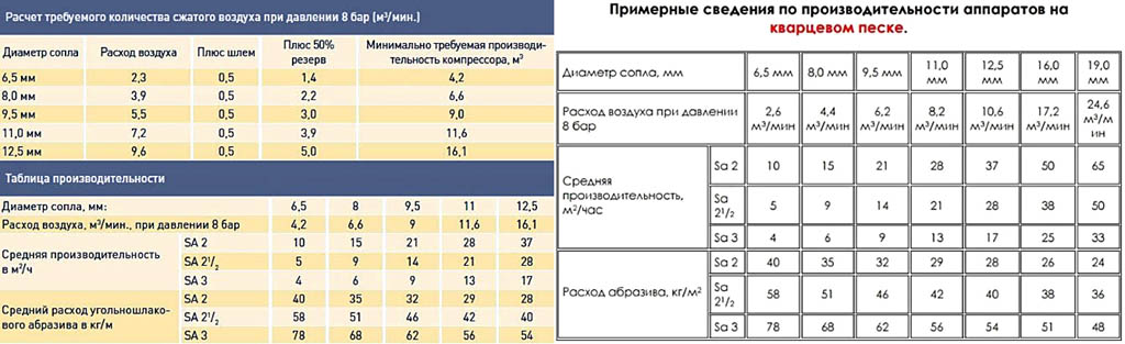 Обычный речной и овражный песок для абразивоструйной обработки абсолютно непригоден: примеси глины в нем импрегнируют обрабатываемую поверхность до полной непригодности детали. Неответственные части изделия (автодиски, днище кузова и т.п.) обрабатывают угольно-шлаковым порошком, для него требуется компрессор меньшей производительности. Хотя расход абразива при этом больше, но сам он намного дешевле, см. рис. Кузова подержанных машин под покраску обрабатывают горным просеянным кварцевым песком, а стекло и особо ответственные изделия (напр., реставрируемые ценные ретро автомобили) – кварцевым карьерным очищенным и тщательно фракционированным. Фракции от 0,05 (хужожественное матирование стекла) до 0,2 мм (очистка от спекшихся загрязнений).