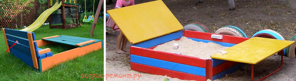 Чтобы не приходилось каждый раз щиты снимать и ставить, можно приделать петли, а чтобы дверцы не висели, приварите ручки, на которые они могут опираться. При откинутой крышке получится две небольшие игровые площадки. На них дети могут сидеть или строить свои песочные замки. Потому удобнее такие крышки делать из фанеры: щелей нет и по весу меньше.