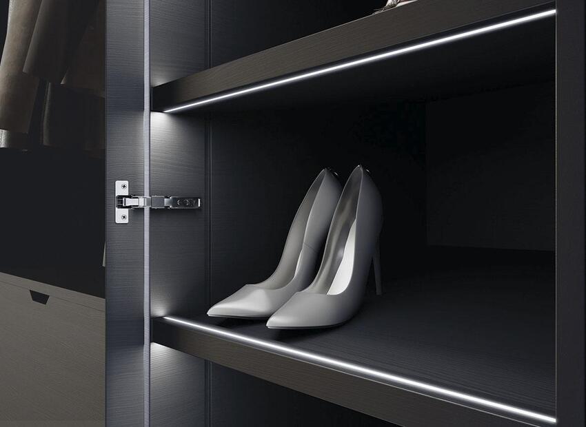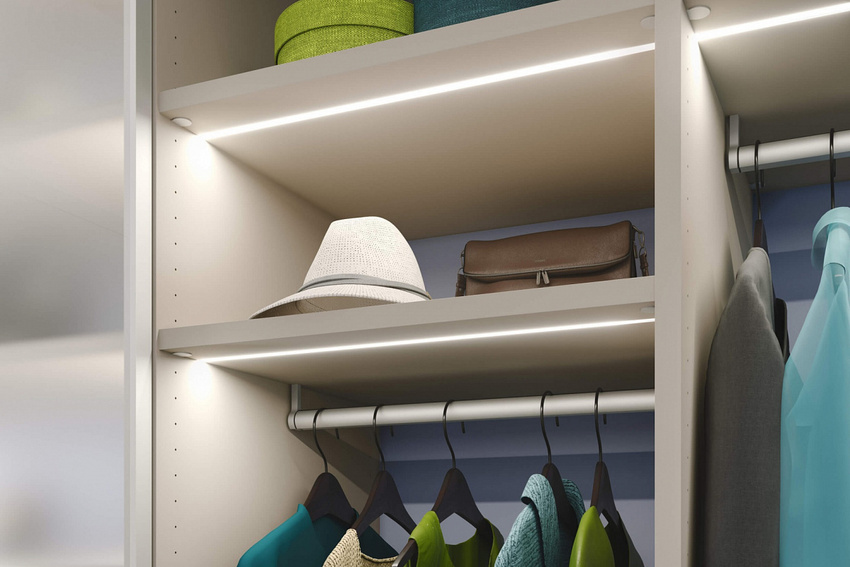Последний вариант наиболее удобен в использовании. Кроме того, выдвижные полки могут подсвечиваться посредством светодиодной ленты, что упрощает процесс поиска вещей.