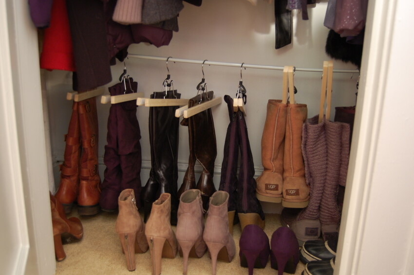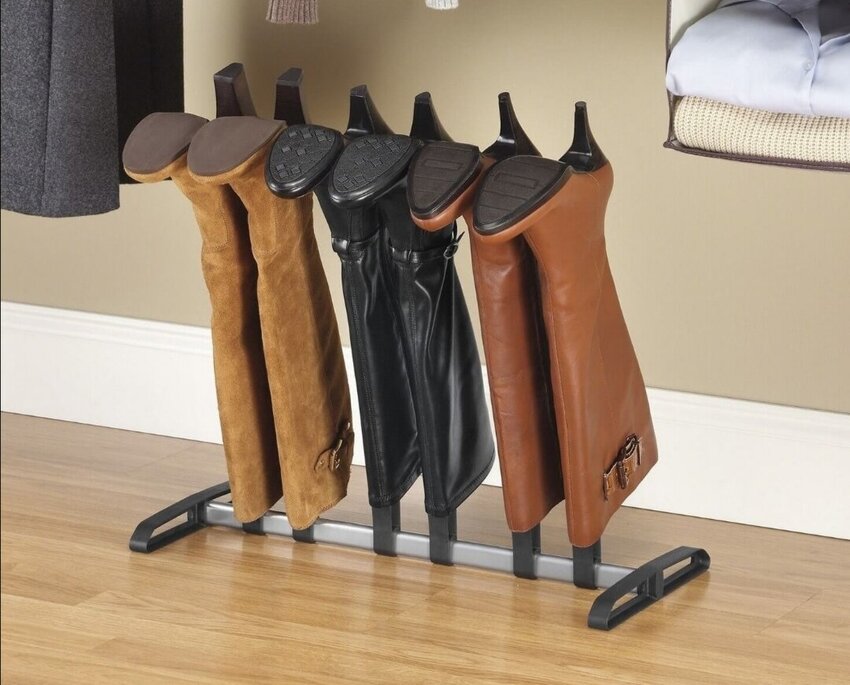 Длинные сапоги удобно размещать на специальных вешалках с защипами. Для этого требуется специальная секция со штангой, высота которой составляет около 60 см.