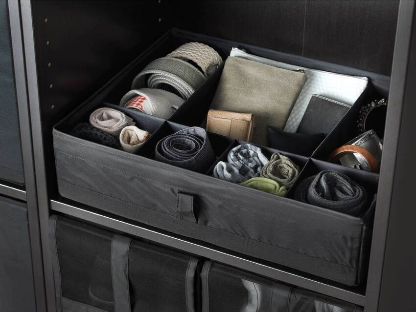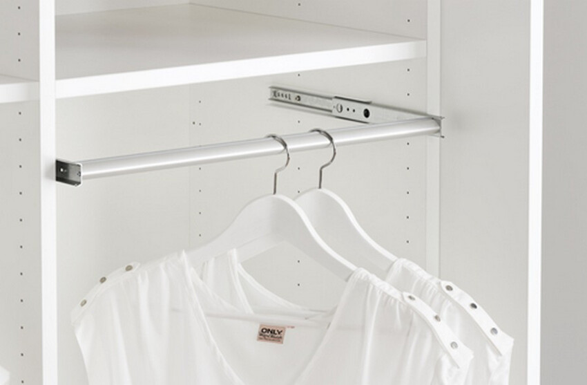 Выдвижные ящики с дном подойдут для хранения нижнего белья, перчаток, а с перекладинами — для брюк и шарфов.