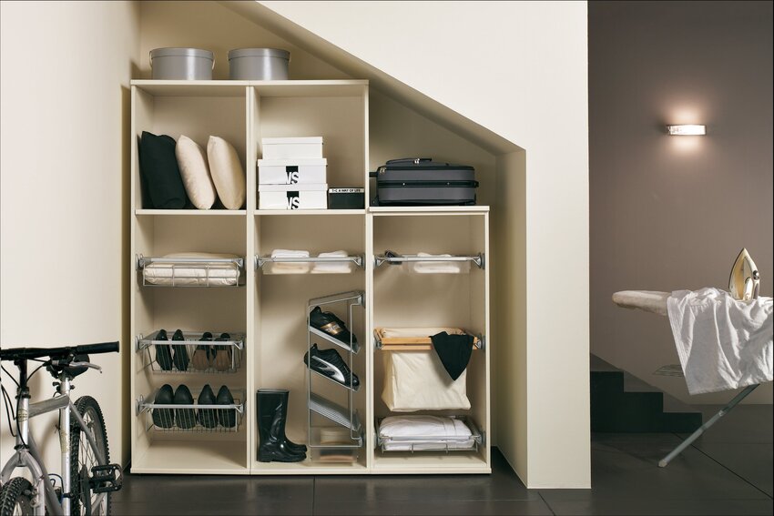 Для хранения сезонных вещей, чемоданов, объемного постельного белья используют верхнюю часть гардеробной. Выше уровня глаз — полки для головных уборов, зонтов и сумок. В самом низу располагают сетки и коробки с обувью. Обувь удобно хранить под наклоном в 45—60° или в крутящихся радиусных конструкциях.
